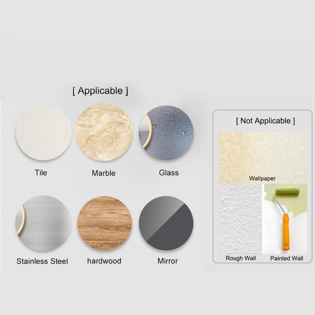 • No-Drill Installation: High-strength self-adhesive backplates provide firm, wobble-free mounting on clean, smooth surfaces (tile, glass, metal, sealed wood, acrylic).